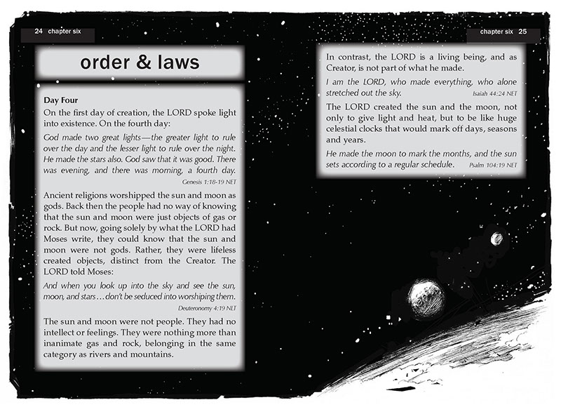 Chronological: Begins with the creation of the universe, and then, progressing sequentially through key Old Testament stories, it moves into the New Testament to reveal the meaning of the cross and the tomb. The main story of the Bible is tied together into one universal, all-encompassing drama.