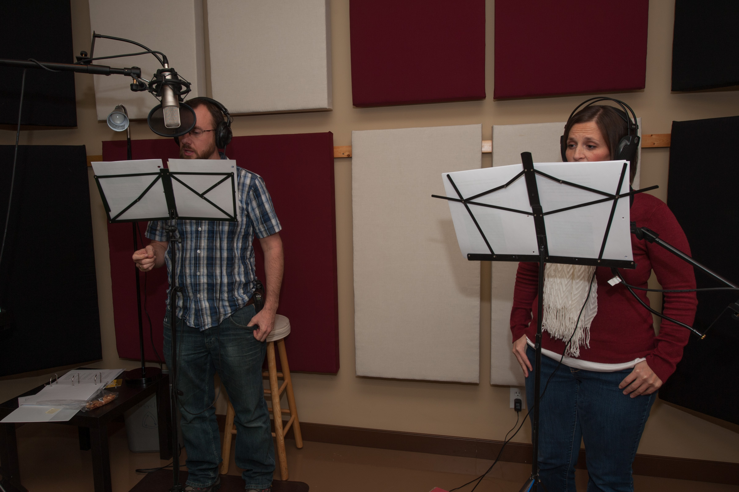 The recording crew spends several hours each morning in the studio. When the blue lights go on, this means recording is happening and the rest of the staff must do their best to keep the noise level down in the office. Though those providing the voice talent are very serious about their craft, the crew is able to have fun in the process. Our two voice talents have also been working hard to preserve their voices between recording sessions.
