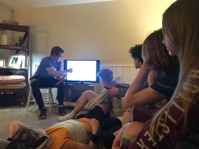 Mark teaching the group the story of the Bible from creation to the cross.